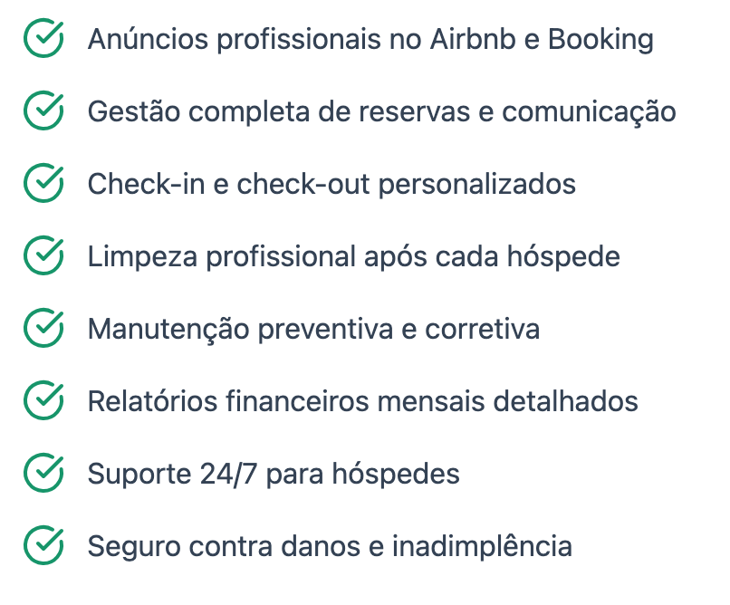 Atendimento ao Hóspede Impecável. Cuidamos da comunicação pré-reserva, check-in e check-out eficientes, e suporte total durante a estadia. Isso gera avaliações positivas, elevando a reputação do seu imóvel e atraindo mais reservas.
